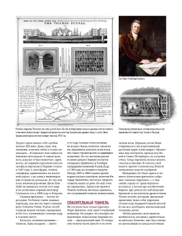 Реклама открытия Темзского тоннеля для публики. На трёх изображениях показаны разные участки тоннеля, Схема проходческого щита, использовавшегося при